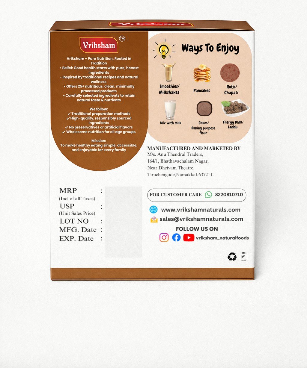 Make nutrition fun and delicious with our Sprouted Ragi Choco Malt — a wholesome blend of sprouted finger millet (ragi), premium nuts, natural cocoa, and pure jaggery powder.